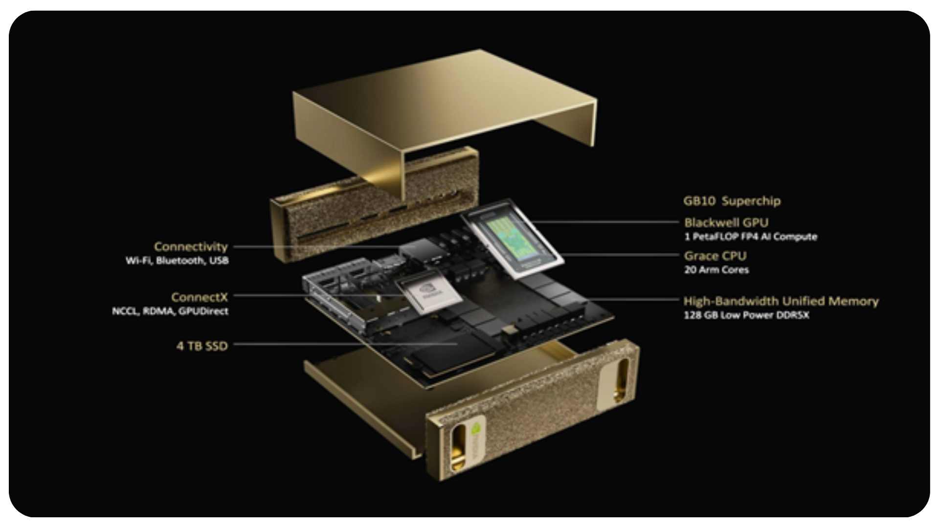 • Combines Grace CPU and Blackwell GPU with unified memory.